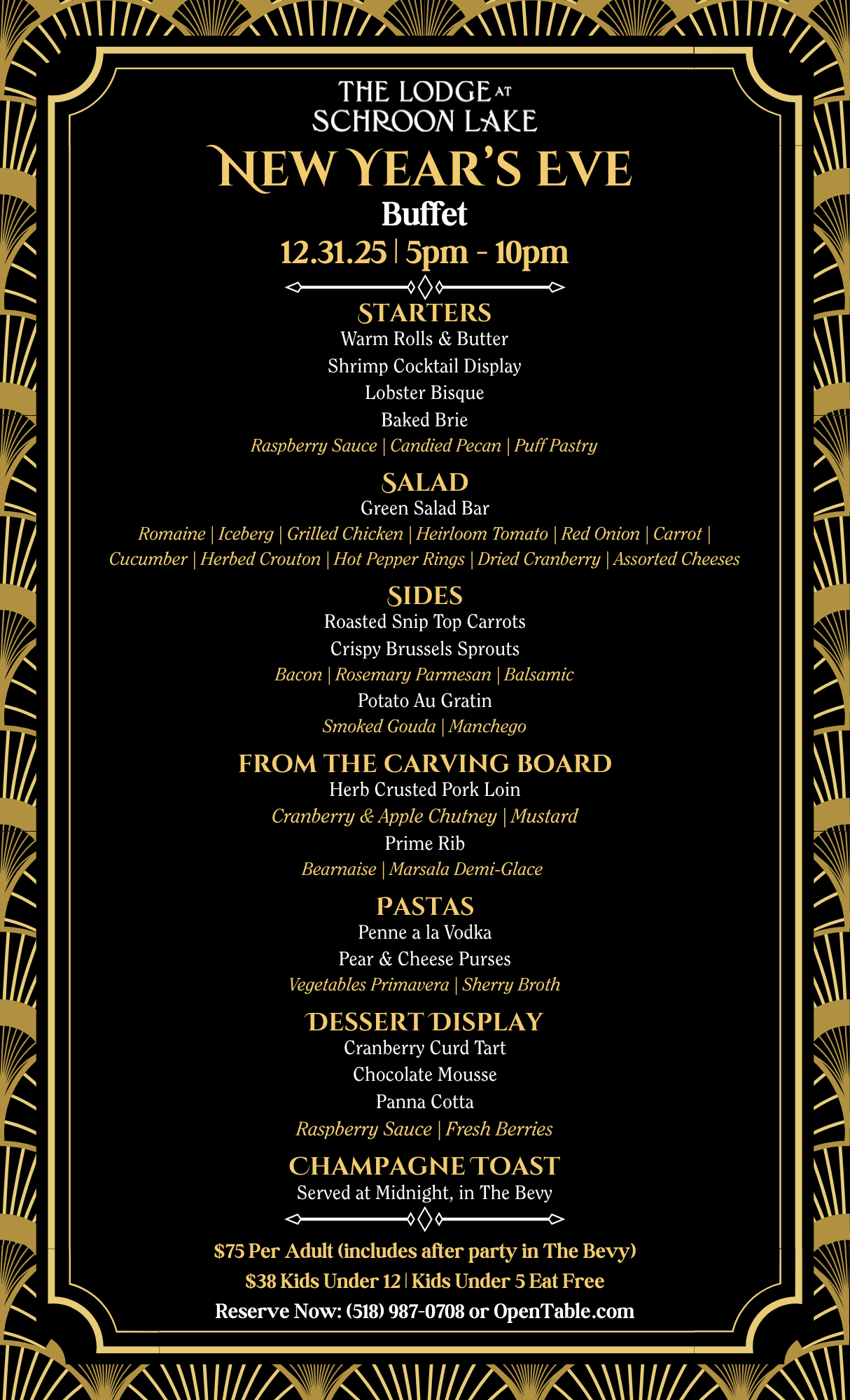 Celebrate New Year’s Eve with a festive buffet of savory dishes and sweet treats. Enjoy a cozy atmosphere, cheerful ambiance, and the chance to savor the occasion with family and friends.