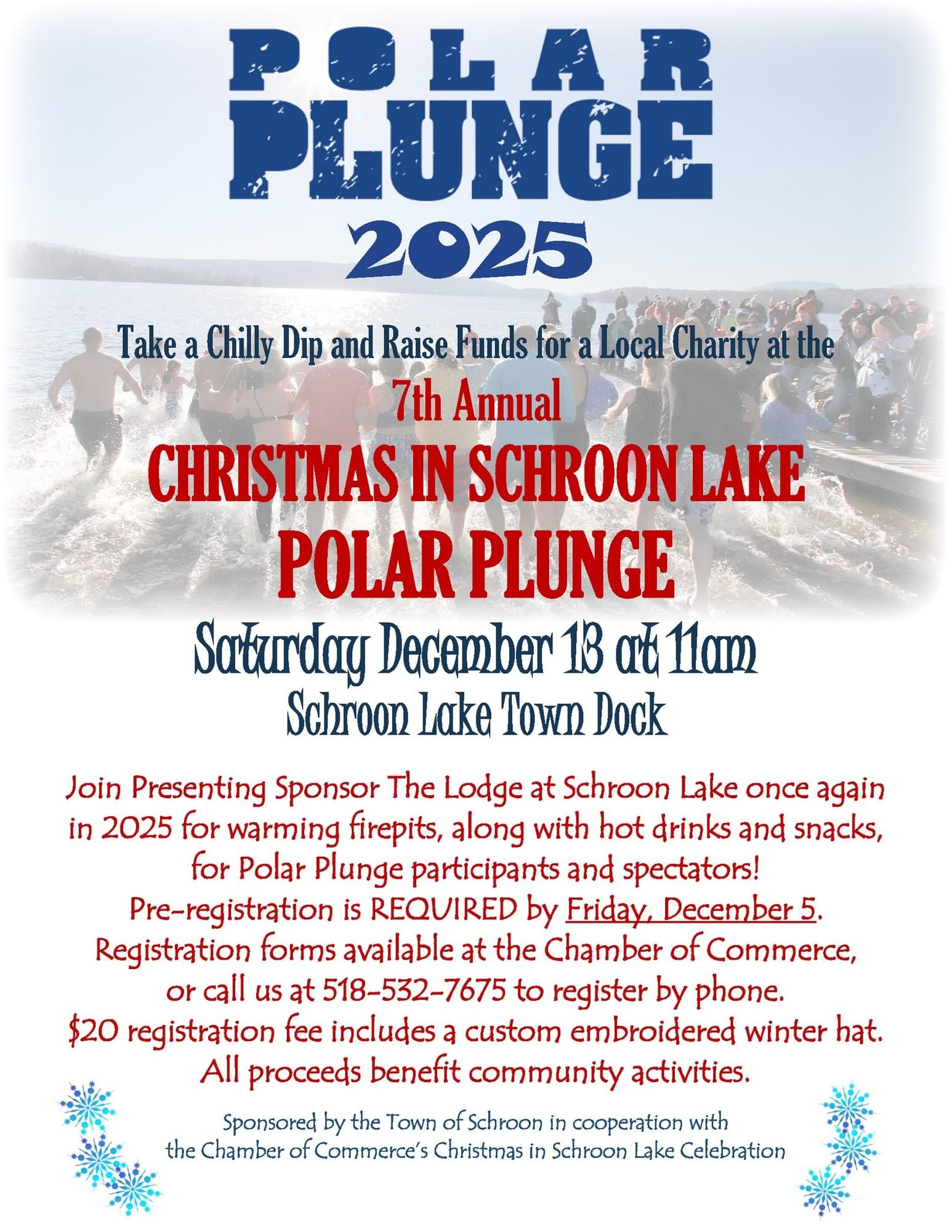 The Lodge at Schroon Lake is proud to return as the 2025 Presenting Sponsor, providing warming firepits, hot drinks, and snacks for both plungers and spectators. Even if you’re staying dry, this is an exciting, family-friendly spectator event filled with holiday cheer, energy, and community spirit.